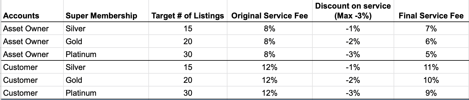 All Super Members will be able to enjoy a maximum of 3% discount on service fee as Super Membership level upgrades as displayed in the chart below. All Super Memberships will be reviewed on an annual basis. Learn more about Super Membership requirements from Performance. Simply put, you are required to maintain at least an overall performance of at least 4.8 and make sure your cancellation rate is below 1% throughout the calendar year (i.e. January 1st - December 31st of every year).